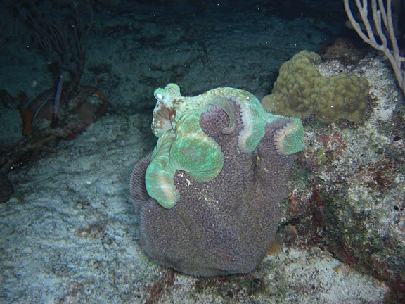 The caribbean reef octopus is a coral reef marine animal. They are rarely seen during the day but are frequently seen at night in shallow saltwater reefs. The combination of blue and green color is something that gets people's attention. Like other octopus species, caribbean reef octopuses are typically solitary and are able to quickly change color using specialized cells in their skin known as chromatophores. The mantle is large and chunky in comparison (up to 60 cm long).